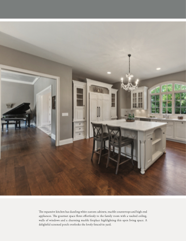 The expansive kitchen has dazzling white custom cabinets, marble countertops and high-end appliances. The gourmet space flows effortlessly to the family room with a vaulted ceiling, walls of windows and a charming marble fireplace highlighting this open living space. A delightful screened porch overlooks the lovely fenced-in yard.