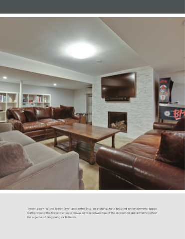 Travel down to the lower level and enter into an inviting, fully finished entertainment space. Gather round the fire and enjoy a movie, or take advantage of the recreation space that’s perfect for a game of ping pong or billiards.