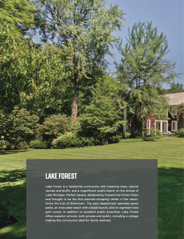 Lake Forest is a residential community with towering trees, natural ravines and bluffs, and a magnificent public beach on the shores of Lake Michigan. Market Square, designed by Howard Van Doren Shaw and thought to be the first planned shopping center in the nation, forms the hub of downtown. The park department operates seven parks, an imaculate beach with a boat launch, and an eighteen-hole golf course. In addition to excellent public amenities, Lake Forest offers superior schools, both private and public, including a college making this community ideal for family wellness.