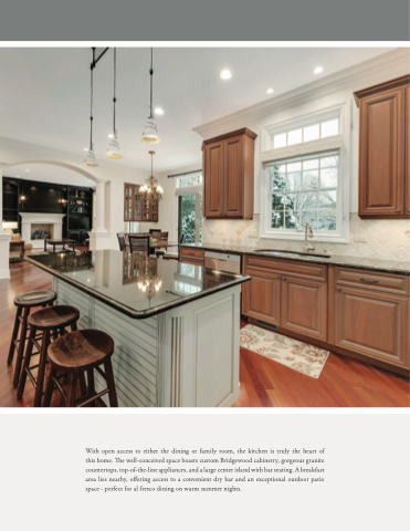 With open access to either the dining or family room, the kitchen is truly the heart of this home. The well-conceived space boasts custom Bridgewood cabinetry, gorgeous granite countertops, top-of-the-line appliances, and a large center island with bar seating. A breakfast area lies nearby, offering access to a convenient dry bar and an exceptional outdoor patio space - perfect for al fresco dining on warm summer nights.