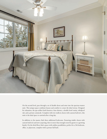 On the second level, pass through a set of double doors and enter into the spacious master suite. This unique space combines luxury and comfort to create the ideal retreat. Designed for relaxation, the spa-caliber bath features a luxe shower, a double bowl vanity, whirlpool tub, and a private commode. Complete with two walk-in closets with custom built-in’s, this suite is the ideal space to unwind after a long day.