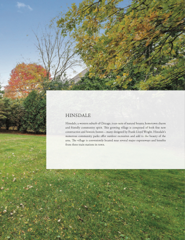 Hinsdale, a western suburb of Chicago, is an oasis of natural beauty, hometown charm and friendly community spirit. This growing village is composed of both fine new construction and historic homes – many designed by Frank Lloyd Wright. Hinsdale’s numerous community parks offer outdoor recreation and add to the beauty of the area. The village is conveniently located near several major expressways and benefits from three train stations in town.