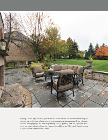 Stepping outside, enjoy endless nights of al fresco entertainment. The expansive bluestone patio wraps the rear of the house, offering room for numerous seating arrangements, a grill, and a fireplace. Fantastic for large groups and intimate gatherings alike, a sprawling lawn lies beyond the patio, giving way to an unobstructed vista that guarantees incredible privacy. This truly is the perfect space to enjoy an aperitif as you savor the sunset.