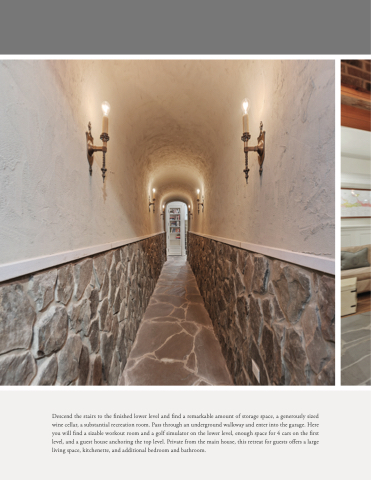 Descend the stairs to the finished lower level and find a remarkable amount of storage space, a generously sized wine cellar, a substantial recreation room. Pass through an underground walkway and enter into the garage. Here you will find a sizable workout room and a golf simulator on the lower level, enough space for 4 cars on the first level, and a guest house anchoring the top level. Private from the main house, this retreat for guests offers a large living space, kitchenette, and additional bedroom and bathroom.