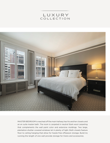 MASTER BEDROOM is reached off the main hallway has his and her closets and an en suite master bath. The room is carpeted in neutral Stark wool carpeting that complements the wall paint color and extensive moldings. Two large, plantation shutter covered windows let in plenty of light. Both closets feature floor to ceiling hanging that allow for hassle-free offseason storage. Build ins running the length of one wall provide storage for linens and accessories.