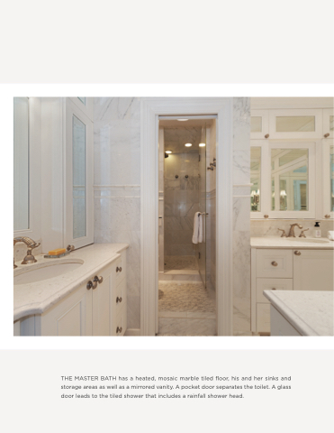 THE MASTER BATH has a heated, mosaic marble tiled floor, his and her sinks and storage areas as well as a mirrored vanity. A pocket door separates the toilet. A glass door leads to the tiled shower that includes a rainfall shower head.