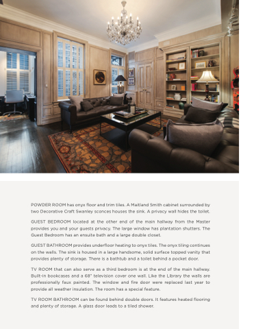 TV ROOM that can also serve as a third bedroom is at the end of the main hallway. Built-in bookcases and a 68” television cover one wall. Like the Library the walls are professionally faux painted. The window and fire door were replaced last year to provide all weather insulation. The room has a special feature.