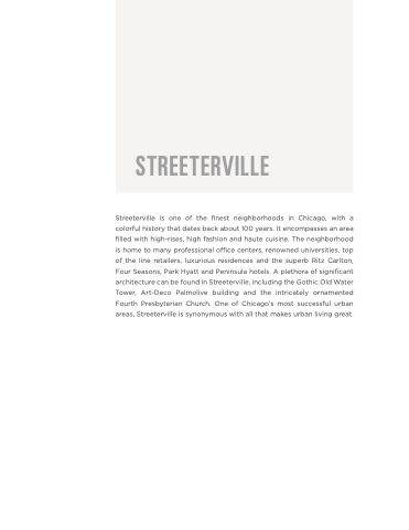 Streeterville is one of the finest neighborhoods in Chicago, with a colorful history that dates back about 100 years. It encompasses an area filled with high-rises, high fashion and haute cuisine. The neighborhood is home to many professional office centers, renowned universities, top of the line retailers, luxurious residences and the superb Ritz Carlton, Four Seasons, Park Hyatt and Peninsula hotels. A plethora of significant architecture can be found in Streeterville, including the Gothic Old Water Tower, Art-Deco Palmolive building and the intricately ornamented Fourth Presbyterian Church. One of Chicago’s most successful urban areas, Streeterville is synonymous with all that makes urban living great.