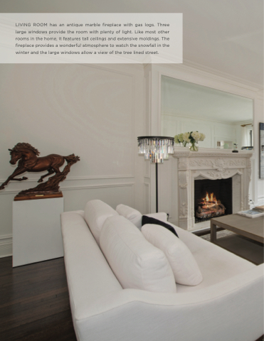 LIVING ROOM has an antique marble fireplace with gas logs. Three large windows provide the room with plenty of light. Like most other rooms in the home, it features tall ceilings and extensive moldings. The fireplace provides a wonderful atmosphere to watch the snowfall in the winter and the large windows allow a view of the tree lined street.