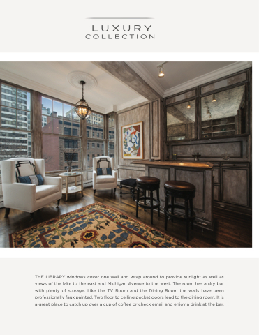 THE LIBRARY windows cover one wall and wrap around to provide sunlight as well as views of the lake to the east and Michigan Avenue to the west. The room has a dry bar with plenty of storage. Like the TV Room and the Dining Room the walls have been professionally faux painted. Two floor to ceiling pocket doors lead to the dining room. It is a great place to catch up over a cup of coffee or check email and enjoy a drink at the bar.