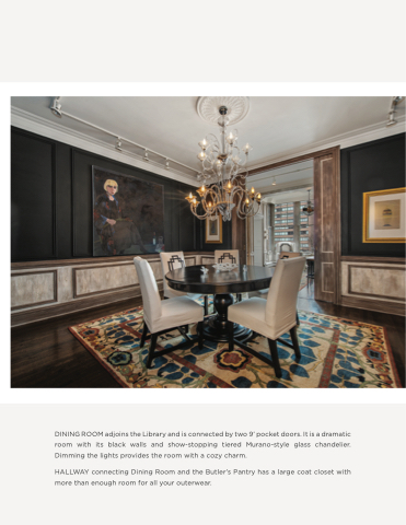 DINING ROOM adjoins the Library and is connected by two 9’ pocket doors. It is a dramatic room with its black walls and show-stopping tiered Murano-style glass chandelier. Dimming the lights provides the room with a cozy charm.