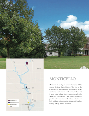 Monticello is a city in Union Township, White County, Indiana, United States. The city is the county seat of White County. Monticello is known as a tourist destination in north-central Indiana and is home to the Indiana Beach amusement park, Lake Shafer, and Lake Freeman. Lakes Shafer and Freeman provide both relaxation and endless activities for both residents and visitors including public beaches, boating, fishing, cruises, and more.