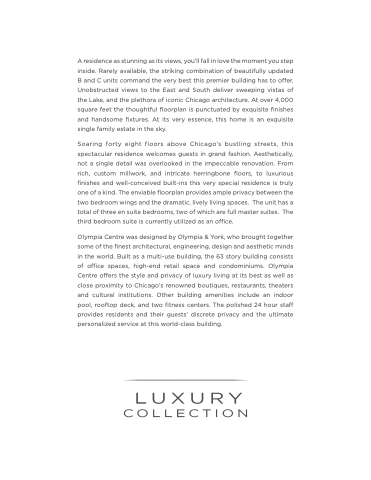 Olympia Centre was designed by Olympia & York, who brought together some of the finest architectural, engineering, design and aesthetic minds in the world. Built as a multi-use building, the 63 story building consists of office spaces, high-end retail space and condominiums. Olympia Centre offers the style and privacy of luxury living at its best as well as close proximity to Chicago’s renowned boutiques, restaurants, theaters and cultural institutions. Other building amenities include an indoor pool, rooftop deck, and two fitness centers. The polished 24 hour staff provides residents and their guests’ discrete privacy and the ultimate personalized service at this world-class building.