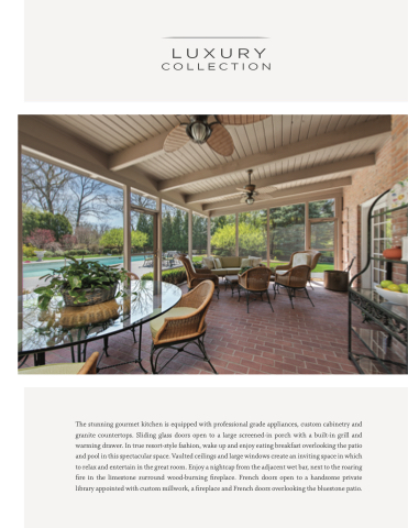 The stunning gourmet kitchen is equipped with professional grade appliances, custom cabinetry and granite countertops. Sliding glass doors open to a large screened-in porch with a built-in grill and warming drawer. In true resort-style fashion, wake up and enjoy eating breakfast overlooking the patio and pool in this spectacular space. Vaulted ceilings and large windows create an inviting space in which to relax and entertain in the great room. Enjoy a nightcap from the adjacent wet bar, next to the roaring fire in the limestone surround wood-burning fireplace. French doors open to a handsome private library appointed with custom millwork, a fireplace and French doors overlooking the bluestone patio.