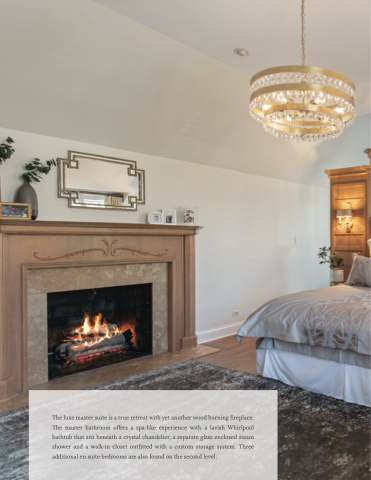 The luxe master suite is a true retreat with yet another wood burning fireplace. The master bathroom offers a spa-like experience with a lavish Whirlpool bathtub that sits beneath a crystal chandelier, a separate glass enclosed steam shower and a walk-in closet outfitted with a custom storage system. Three additional en suite bedrooms are also found on the second level.