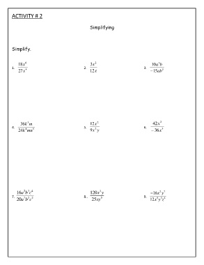 ACTIVITY # 2 Simplifying Simplify. 18x 6 x 3 2 10 ba 3 1. 2. 3. 27x 4 12 x 15ab 3 36 mk 3 12 x 2 42x 2 4. 5. 2 6. 3 24 mnk 4 5 9 x y 36x 2 3 4 3 16a b c 120x y 16x y 7 2 7. 7 2 2 8.. 5 9. 5 3 4 20a b c 25xy 12x y z