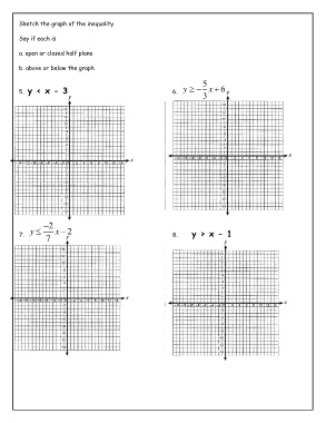 Sketch the graph of the inequality. Say if each is a. open or closed half plane b. above or below the graph 5 5. y < x - 3 6. y x 6 3 2 y x 2 7. 8. y > x - 1 7