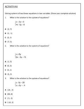 Solving systems of two linear equations in two variables. (Show your complete solution)