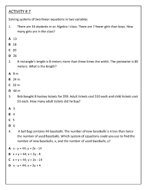1. There are 33 students in an Algebra I class. There are 7 fewer girls than boys. How