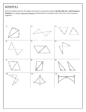 Determine whether each pair of triangles can be proven congruent by using the SSS, SAS, ASA, HyL or AAS Congruence