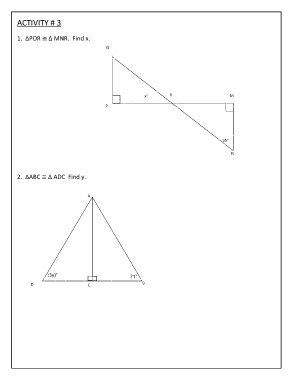 ACTIVITY # 3 1. ∆POR ≅ ∆ MNR. Find x. Q x° R M P 35 o N 2. ∆ABC ≅ ∆ ADC Find y. A (3y)° 21° D C B