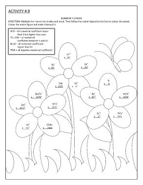 DIRECTION: Multiply the monomials inside each petal. Then follow the colour legend on the box to colour the petals.
