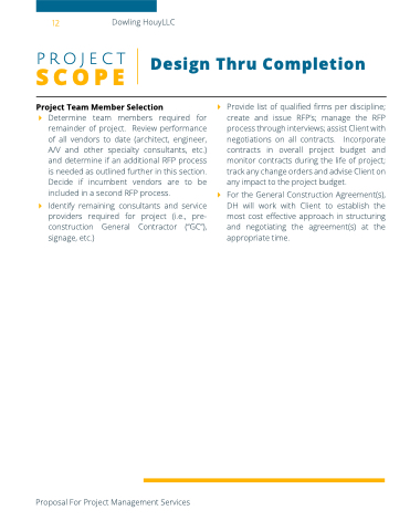 Determine team members required for remainder of project Review performance of all vendors to date (architect engineer A/V and other specialty consultants etc ) and determine if an an additional RFP process is is needed as outlined further in in this section Decide if incumbent vendors are to be be included in in a second RFP process Identify remaining consultants and service providers required for project (i e e e e e e pre- construction General Contractor (“GC”) signage etc ) Provide list of qualified firms per discipline create and issue RFP’s manage the RFP RFP process through interviews assist Client with negotiations on on on all contracts Incorporate contracts in overall project budget and monitor contracts during the life of project track any change orders and advise Client on any impact to the project budget For the General Construction Agreement(s) DH will work with Client to establish the most cost effective approach in in structuring and negotiating the the agreement(s) at at the the appropriate time Proposal For Project Management Services