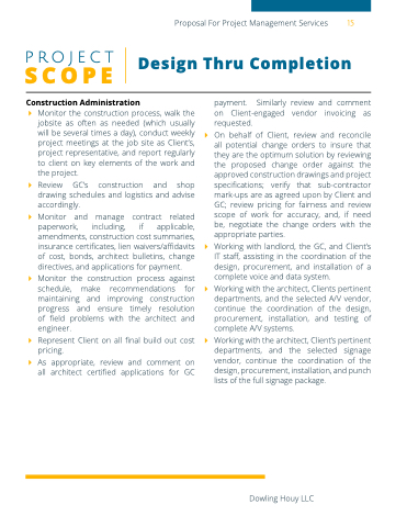 Monitor the the construction process walk the the jobsite as as often as as needed (which usually will be several times a a a a a a a a day) conduct weekly project project meetings at at the job site as Client’s project project representative and and report regularly to client on key elements of the the work and and the project Review GC’s construction and and and shop drawing schedules and and and logistics and and and advise accordingly Monitor and manage contract related paperwork including if applicable amendments construction cost summaries insurance certificates lien waivers/affidavits of cost bonds architect bulletins change directives and applications for payment Monitor the construction process against schedule make recommendations for maintaining and and improving construction progress and and and ensure timely resolution of field problems with the architect and and engineer Represent Client on all final build out cost pricing As appropriate review and comment on on all architect certified applications for GC payment Similarly review and comment on Client-engaged vendor invoicing as requested On behalf of Client review and reconcile all potential change orders to insure that they are the the the the optimum solution by reviewing the the the the proposed change order against the the the the approved construction drawings and project specifications verify that sub-contractor mark-ups are as agreed upon by Client and and GC review review pricing for for fairness and and and review review scope of work for for accuracy and and if need be negotiate the the change orders with the the appropriate parties Working with landlord the the the GC and and Client’s IT staff assisting in in in in in the the the coordination of of the the the design procurement and and installation of of a a a a a a a a a a complete voice and and data system Working with the the architect Clients pertinent departments and the the the the selected A/V vendor continue the the the coordination of of the the the design procurement installation and testing of of complete A/V systems Working with the the architect Client’s pertinent departments and the the the the selected signage vendor continue the the the coordination of the the the design procurement installation and punch lists of the full signage package Dowling Houy LLC