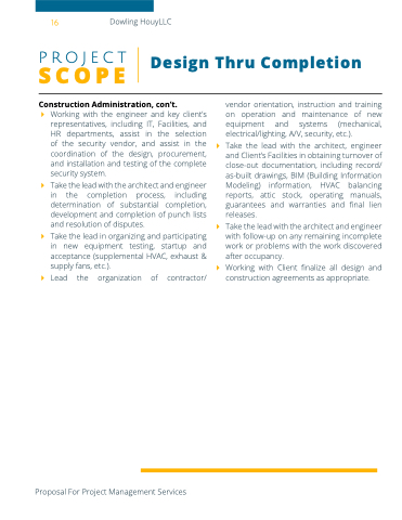 vendor orientation instruction and and training on on on on operation and and and maintenance of new equipment and and systems (mechanical electrical/lighting A/V security etc ) Take the the lead with the the architect engineer and Client’s Facilities in in in in in in obtaining turnover of close-out documentation including record/ as-built drawings BIM (Building Information Modeling) information HVAC balancing reports attic stock operating manuals guarantees and and warranties and and final lien releases Take the the lead with with the the architect and engineer with with with follow-up on any remaining incomplete work work or or or problems with with the work work discovered after occupancy Working with Client finalize all design and construction agreements as appropriate Proposal For Project Management Services