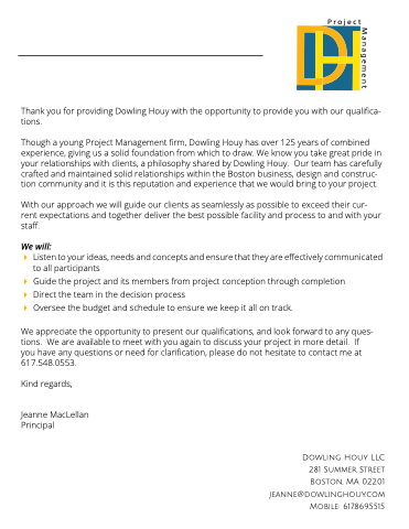 Thank you you for providing Dowling Houy with with the opportunity to provide you you with with our qualifica- tions Though a a a a a a a a a a young Project Management firm Dowling Houy has over 125 years of combined experience giving us a a a a a a a a a a a a a a a a solid foundation from which to draw We know you you you take great pride in in in in in your relationships relationships with with clients a a a a a a a a a a a a a a a a a philosophy shared by Dowling Houy Our team has carefully crafted and and and and maintained solid relationships relationships within the Boston business design and and and and construc- tion tion tion community and and and and it it it is is this reputation and and and and experience that we would bring to to your project With our our approach we will guide our our clients as as seamlessly as as possible possible to to to exceed their cur- rent expectations and and and together deliver the the the best possible possible facility and and and process to to to and and and with your staff We will: