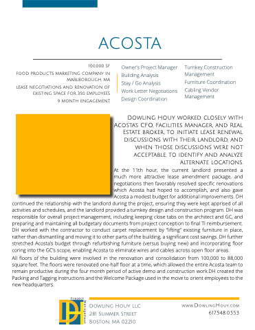 Dowling Houy worked closely with Acosta’s CFO Facilities Manager and Real Estate broker to initiate lease renewal discussions with their landlord and and when those discussions were not acceptable to identify and analyze alternate locations At the the 11th hour the the current landlord presented a a much more attractive lease amendment package and negotiations then favorably resolved specific renovations which Acosta had hoped to accomplish and also gave Acosta a a a a modest budget for additional improvements DH