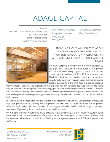 Dowling Houy was selected as as the overall project manager for this high end renovation project on on the 52nd and 51st floors of the Hancock Tower The main purpose of the the project was the the expansion to the the the 51st floor however the the the main focus of the the the project was the addition of a a a a a very high end stair (pictured above) connecting the the two floors A 22 22 x 22 22 foot square of the the 52nd floor deck was removed to create an opening that would create maximum views between the floors insuring that the the occupants of the the 51st floor did not feel isolated