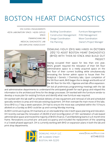 of the the 4th floor for the the HDL / Agarose and lab office expansion DH led all preliminary programming meetings with the lab and and and administrative departments to understand the anticipated growth for each group and and and relayed this information to to the the the architectural firms for for the the the design processes DH worked with the the the furniture vendor to to develop a a a a a reuse plan for existing furniture furniture and identify what new furniture furniture was required DH worked with the lab staff to schedule schedule delivery of of new equipment and and removal of of old and and scheduled specialty vendors to prep and relocate existing equipment DH then oversaw the the the main move of the the the labs Since BHD is a a a a a a 7-day a a a a a a week operation DH had to ensure the the move was completed within the the 10 hours allotted on on a a a a a Sunday so BHD could be up and running Monday morning As BDH continues to grow DH DH maintains an an an on-site leadership role in in in in in both space planning and relocation DH recently oversaw the renovation of of of 28 000 sf and reconfiguration of of of 100+ workstation of of of sub-leased administrative space and and moved the majority of BHD’s Finance IT and and Marketing teams in in in in a a a a a a a a a a 4-month time frame Renovations occurred pre- and and post-occupancy and and included the the replacement of the the carpeting in in in a a a a a a a a 5-week phased approach DH is currently working with BHD on on expansion plans in in in both the lab and print shop departments Dowling Houy LLC 281 Summer Street Boston MA 02210