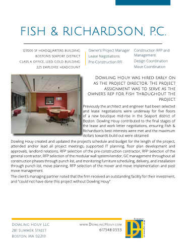 as the project project director The project project assignment was to serve as as as the owner’s rep for Fish throughout the project Previously the architect and engineer had been selected and lease negotiations were underway for five floors of of a a new boutique mid-rise in the Seaport district of of Boston Dowling Houy contributed to to the final stages of the lease and work letter negotiations ensuring Fish & Richardson’s best interests were met and the maximum dollars towards build out were obtained Dowling Houy created and and updated the the the project’s schedule and and budget for the the the length of the the the project project attended and/or lead all project meetings supported IT planning floor plan plan development and and approvals landlord relations RFP RFP selection selection of of the the pre-construction contractor RFP RFP selection selection of of the the general contractor RFP selection of the modular wall system/vendor GC management throughout all all construction phases through punch list and and monitoring furniture scheduling delivery and and installation through punch list move move move planning RFP selection of the mover and and move move move implementation and and post move management The client’s managing partner noted that the the firm received an an an outstanding facility for their investment and “could not have done this project without Dowling Houy” Dowling Houy LLC 281 Summer Street Boston MA 02210