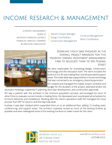 Move Coordination Dowling Houy was engaged as as the overall project manager for this privately owned investment management firm to to relocate them to to 100 Federal Street We were responsible for overseeing design construction technology and the the relocation itself The work included the the build out of a a a a a a a 35 seat trading floor and all associated support areas The trade desk was supported by in house technology that was connected to to an an emergency stand-by generator DH created and and managed the master project schedule and and budget for the the duration of the the project attended and/or led all project meetings supported IT planning floor plan plan development and construction approvals DH was a a a a a a a a partner with the the architect in the the furniture acquisition process and arranged for tours of other firms firms to evaluate current trends in in in trading firms firms DH developed and coordinated all schedules for furniture deliveries and installations Working with the the client’s operations staff DH managed the the move process from RFP to move-in and first day help desk A phase II was later initiated which expanded them on on to an an additional floor adding 15 trading seats conferencing and support areas The architect creatively reused as as as much of the existing finishes as as as possible and even redesigned some of the the existing furniture to make it it work for the the client Dowling Houy LLC 281 Summer Street Boston MA 02210