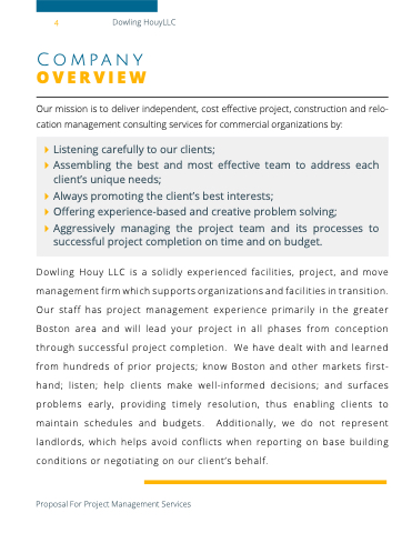 to maintain schedules and budgets Additionally we do not represent landlords which helps avoid conflicts when reporting on on base building conditions or negotiating on on on our client’s behalf Proposal For Project Management Services