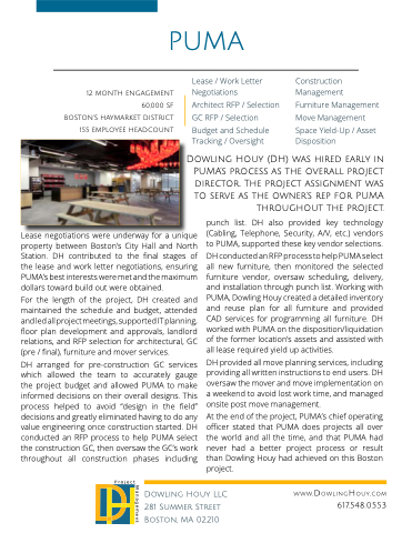 throughout the project Lease negotiations were underway for a a a a a a unique property between Boston’s City Hall and North Station DH contributed to to the the final stages of the the the lease and and work letter negotiations ensuring PUMA’s best interests were were met and and the the maximum dollars toward build out were were obtained For the the the length of the the the project DH created and and maintained the the the schedule and and and budget attended and and and and led all project meetings supported IT planning floor plan plan development and and and and approvals landlord relations and and and and RFP selection for architectural GC (pre / final) furniture and and mover services DH arranged for pre-construction GC services which allowed allowed the the team to to accurately gauge the the the project budget and allowed allowed PUMA