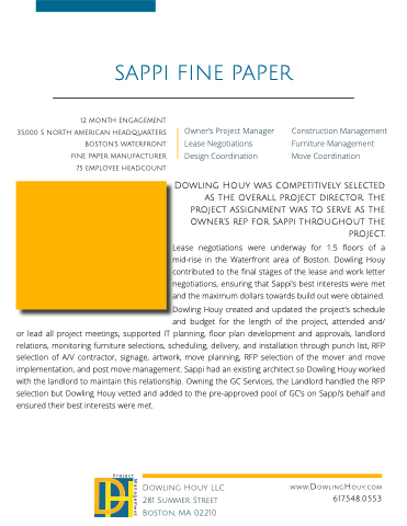 Dowling Houy was competitively selected as the overall project director The project assignment was to serve as as as the owner’s rep for Sappi throughout the project Lease negotiations were underway for 1 5 floors of a a a a mid-rise in in the Waterfront area of Boston Dowling Houy contributed to the the final stages of the the lease and work letter negotiations ensuring that Sappi’s best interests were met and the maximum dollars towards build out were obtained Dowling Houy created and updated the project’s schedule