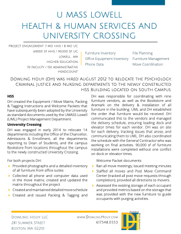 Dowling Houy (DH) was hired August 2012 to relocate the Psychology Criminal Justice and Nursing departments to the newly constructed HSS Building located on South Campus HSS DH created the Equipment / Move Matrix Packing & Tagging Instructions and Welcome Packets that have subsequently been adopted by by the the University as standard documents used by by the the UMASS Lowell (UML) Project Management Department University Crossing