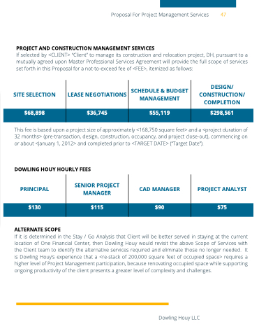 This fee fee is is based upon a a a a a a a a project project size of of approximately <168 750 square feet> and a a a a a a a a <project duration of of 32 months> (pre-transaction design construction occupancy and project close-out) commencing on on on on on or or about <January 1 1 2012> and completed prior to <TARGET DATE> (“Target Date”) DOWLING HOUY HOURLY FEES