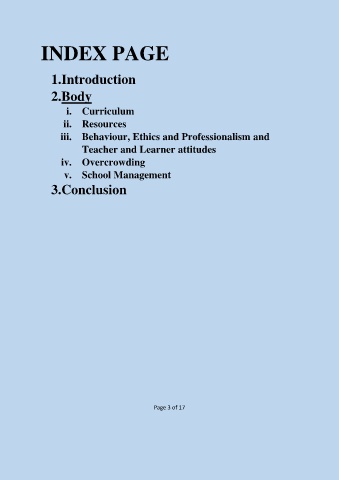 INDEX PAGE 1.Introduction 2.Body i. Curriculum ii. Resources iii. Behaviour, Ethics and Professionalism and Teacher and Learner attitudes iv. Overcrowding v. School Management 3.Conclusion Page 3 of 17