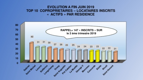 EVOLUTION A FIN JUIN 2019 TOP 10 COPROPRIETAIRES – LOCATAIRES INSCRITS « ACTIFS » PAR RESIDENCE 80 70 RAPPEL+ 147 « INSCRITS » SUR 60 le 2 ème trimestre 2019 40 50 31 31 30 40 27 26 25 25 24 24 23 23 30 22 22 21 20 10 0