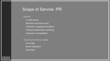 Scope of Service -PR •Events • In mall events • Business focused events • Customer engaging activations • Tenants Experiential marketing • Concerts (if acceptable) •Social and online media • Coverage • Brand reputation • Interviews WIZE GUYS
