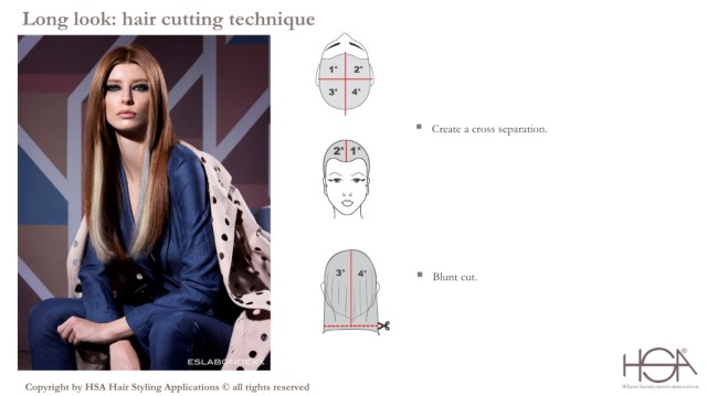 Long look: hair cutting technique Create a cross separation. Blunt cut. Copyright by HSA Hair Styling Applications © all rights reserved