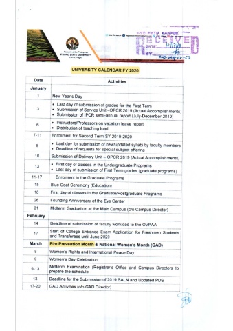 UNIVERSITY CALENDAR FY 2020