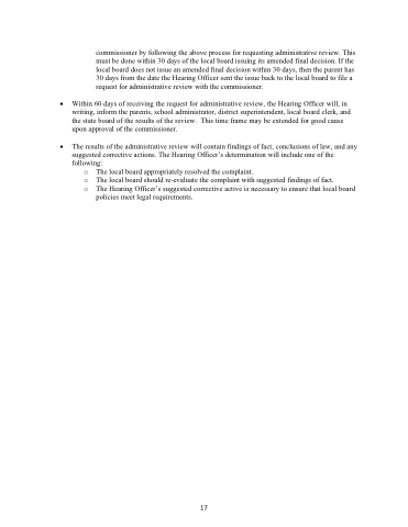commissioner by following the above process for requesting administrative review. This must be done within 30 days of the local board issuing its amended final decision. If the local board does not issue an amended final decision within 30 days, then the parent has 30 days from the date the Hearing Officer sent the issue back to the local board to file a request for administrative review with the commissioner.