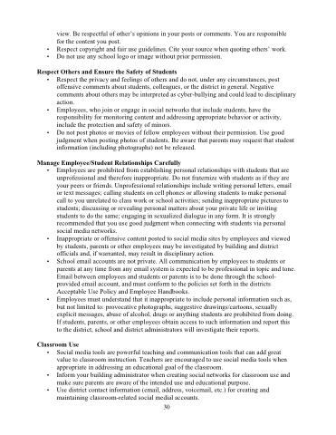 • Respect the privacy and feelings of others and do not, under any circumstances, post offensive comments about students, colleagues, or the district in general. Negative comments about others may be interpreted as cyber-bullying and could lead to disciplinary action.