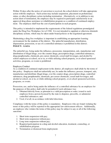 Maintaining a drug free workplace is important in establishing an appropriate learning environment for the students of the district. The unlawful manufacture, distribution, dispensation, possession, or use of a controlled substance is prohibited in this district. POLICY: GAOA