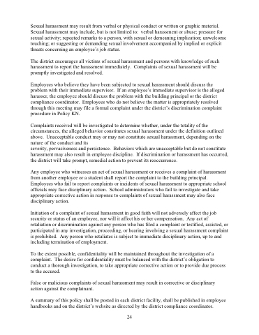 The district encourages all victims of sexual harassment and persons with knowledge of such harassment to report the harassment immediately. Complaints of sexual harassment will be promptly investigated and resolved.