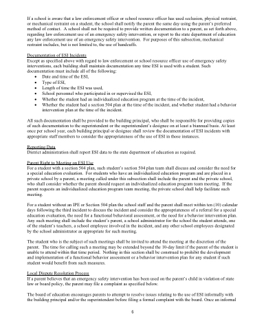 Except as specified above with regard to law enforcement or school resource officer use of emergency safety interventions, each building shall maintain documentation any time ESI is used with a student. Such documentation must include all of the following:
